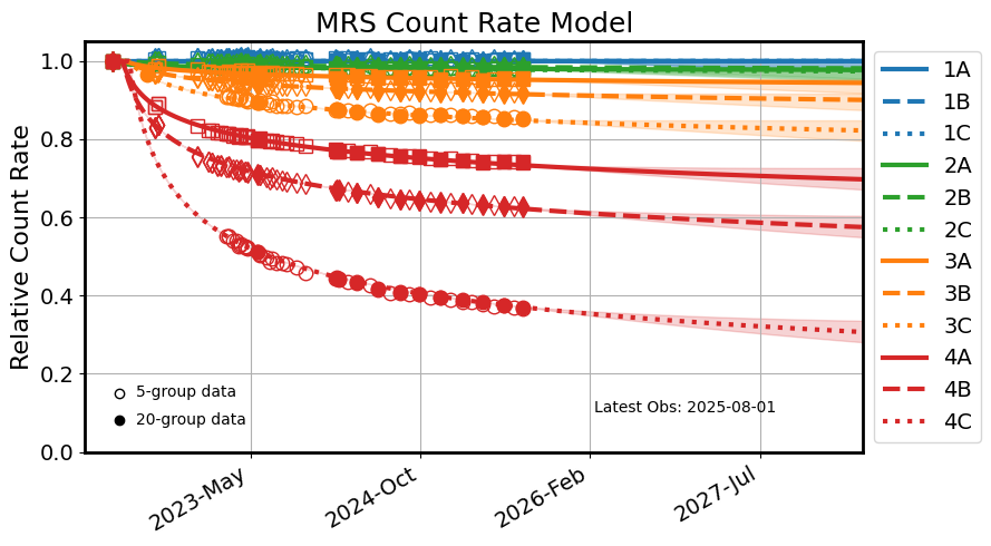 Figure 1: Time-dependent decrease in the observed MRS count rate as measured from internal calibration lamp exposures. Points illustrate measurements at the central wavelength of each of the 12 MRS bands; curves represent the best fit models used for correction in the pipeline. See JDox for an updated version of this figure.