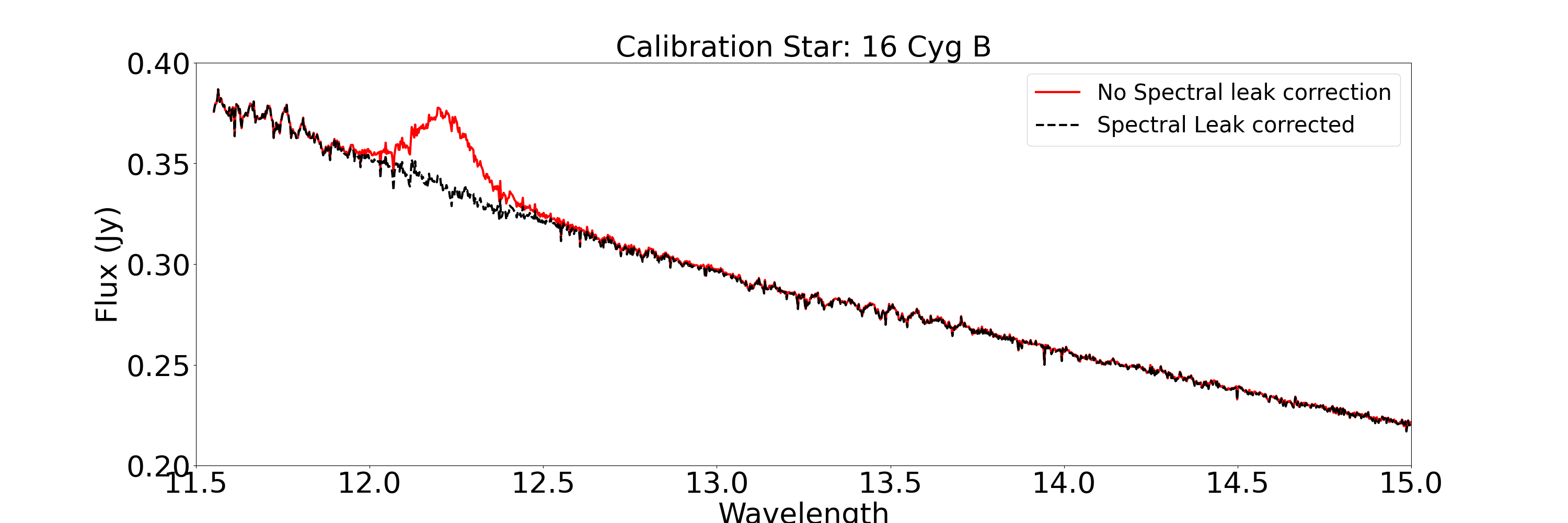 Figure: MRS spectral leak as seen in G Dwarf star. The red extracted spectrum does not have the spectral_leak step applied, while the the black extracted spectrum has the spectral leak correction applied.